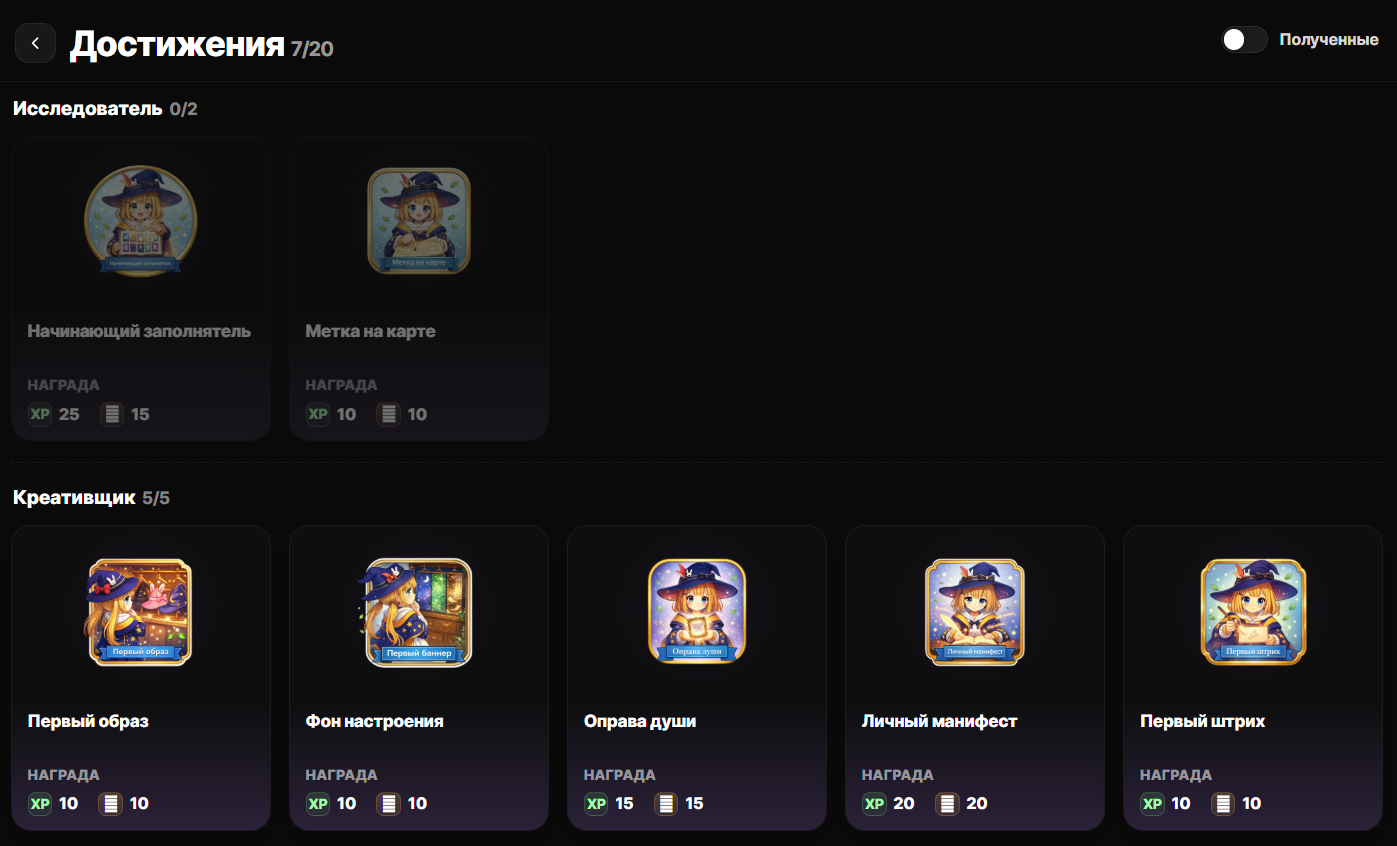 Ниже скриншот карточек достижений, пока карточки без иконок (рисуем)